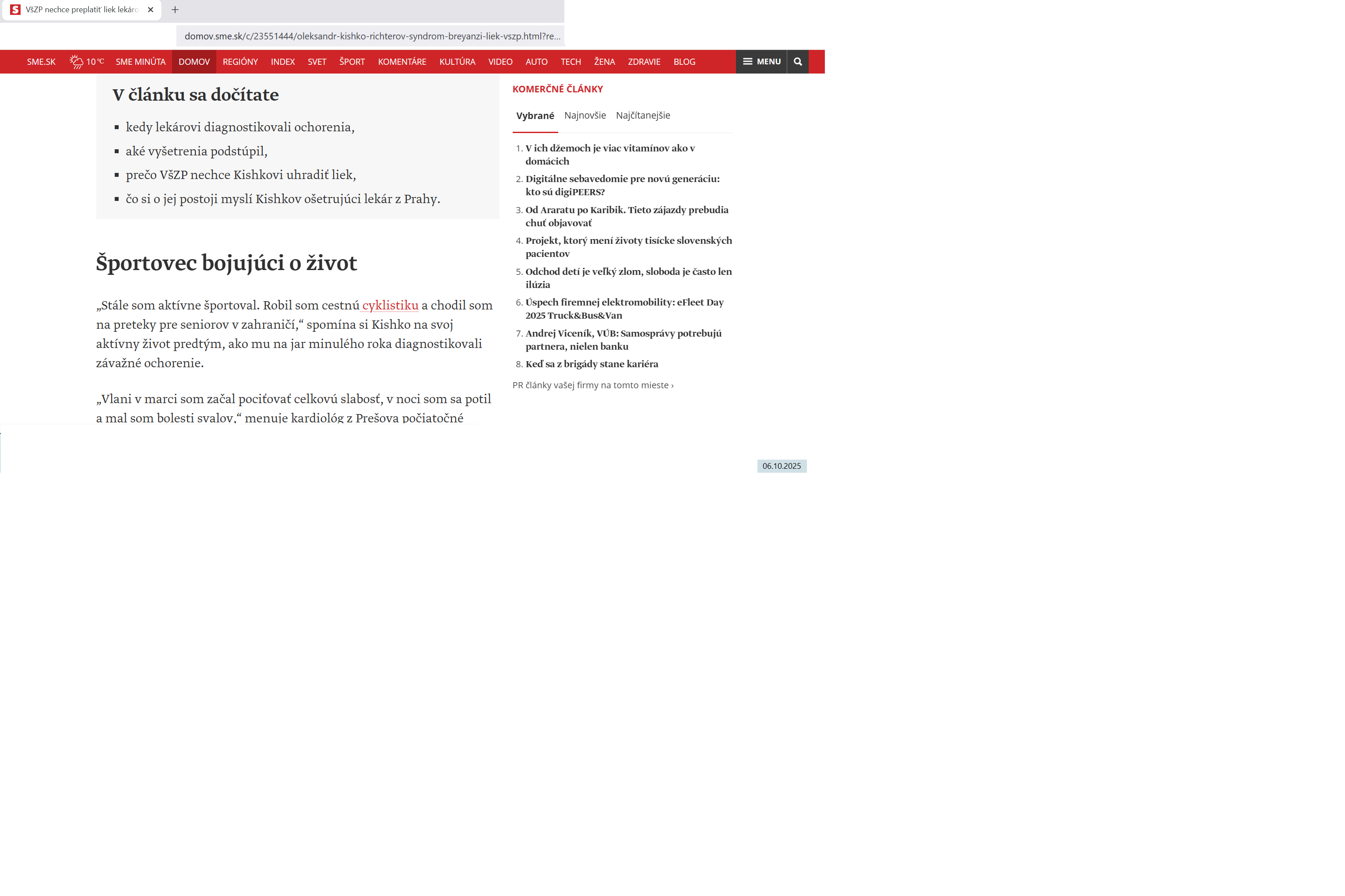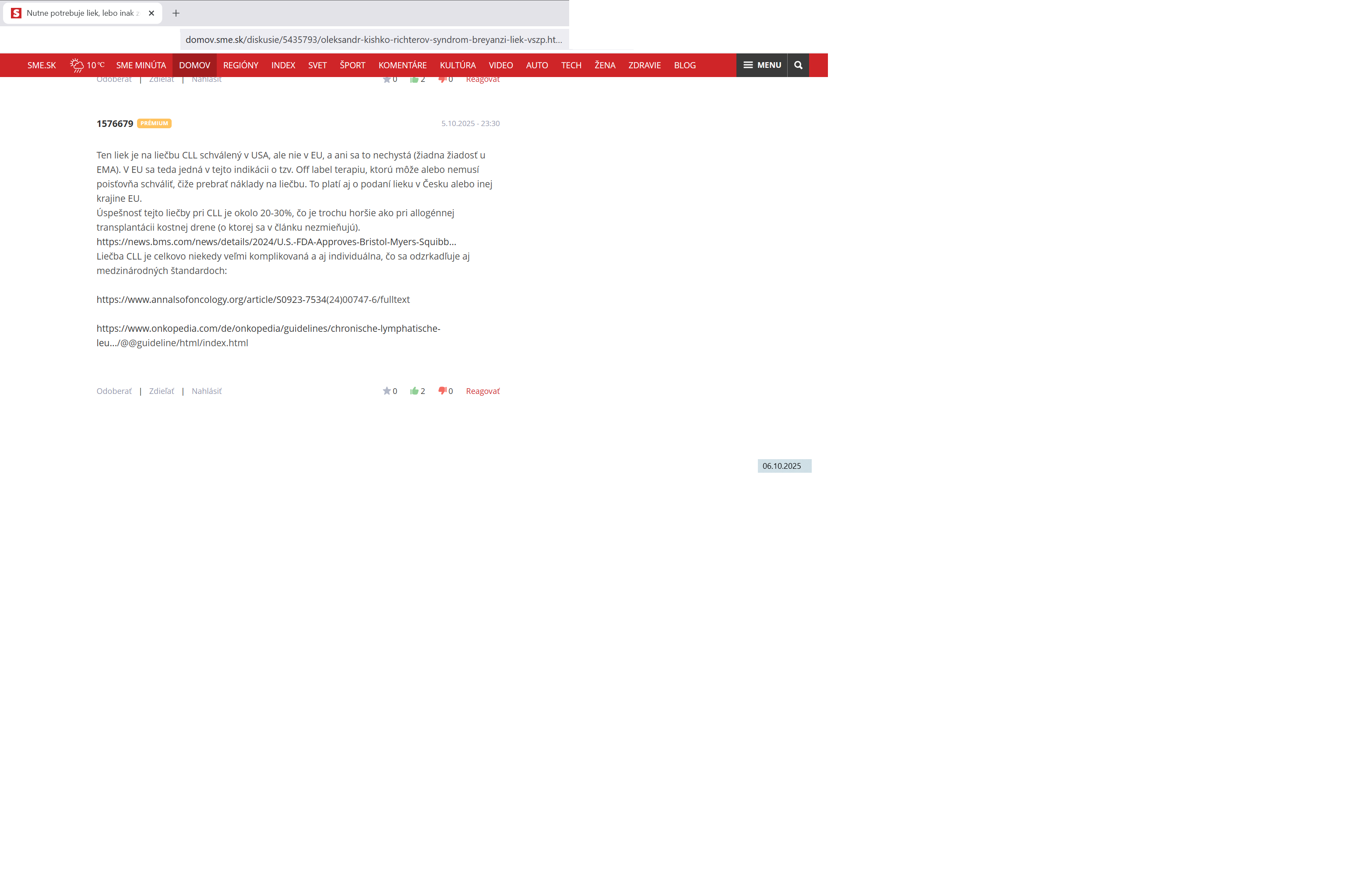 V článku som nenašla inú možnú alternatívu liečby, ktorá by bola účinná. Našla som iba túto liečbu. Len kto to zaplatí? Nie, nezastávam si zdravotnú poisťovňu: ja si myslím, že najlepšie by bolo, keby si každý svoju liečbu platil priamo, bez zdravotných poisťovní. To by sa i lekári viac snažili, i pacienti by viac dbali na svoju životosprávu. Lebo v článku som sa dočítala, že prešovský lekár športoval, ale nedočítala som sa, ako sa stravoval.