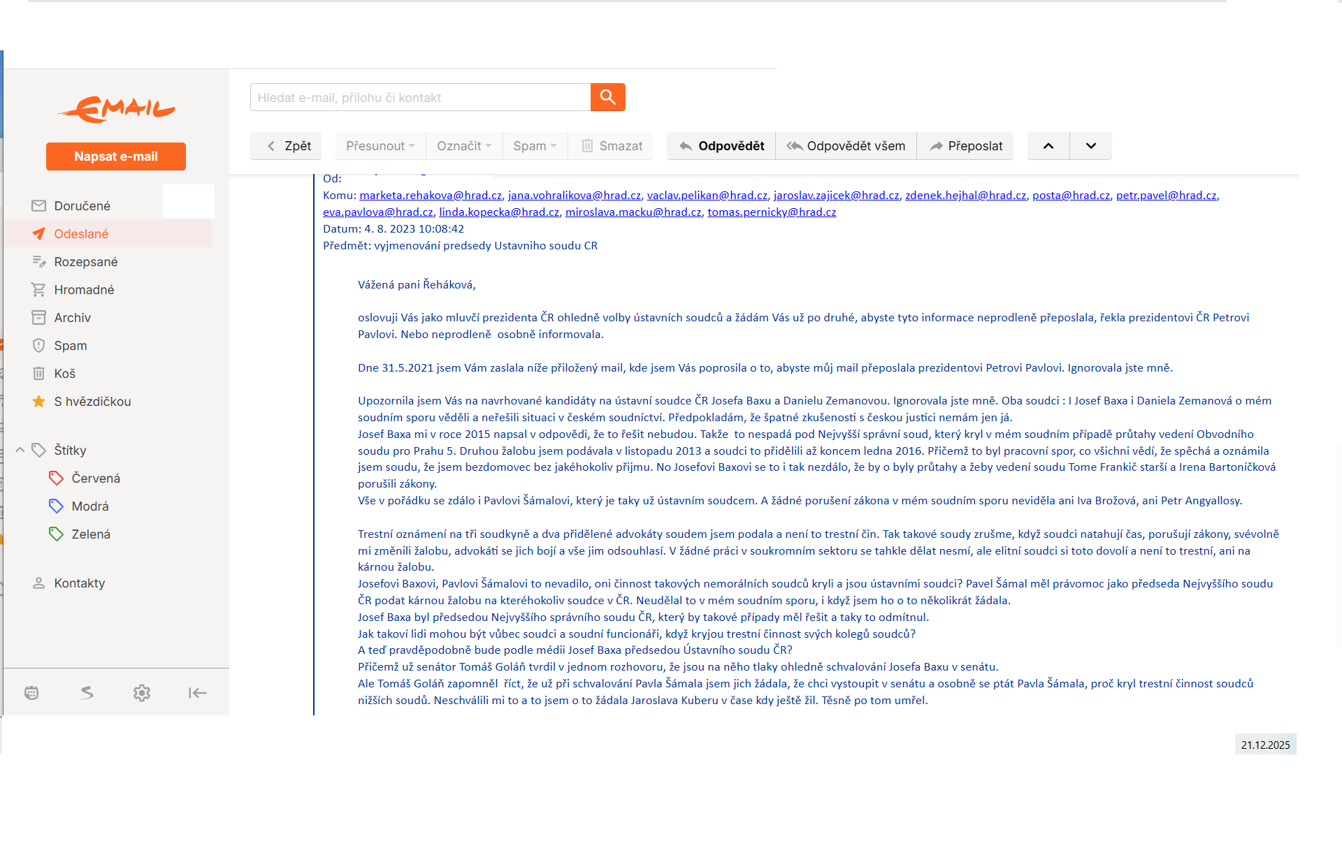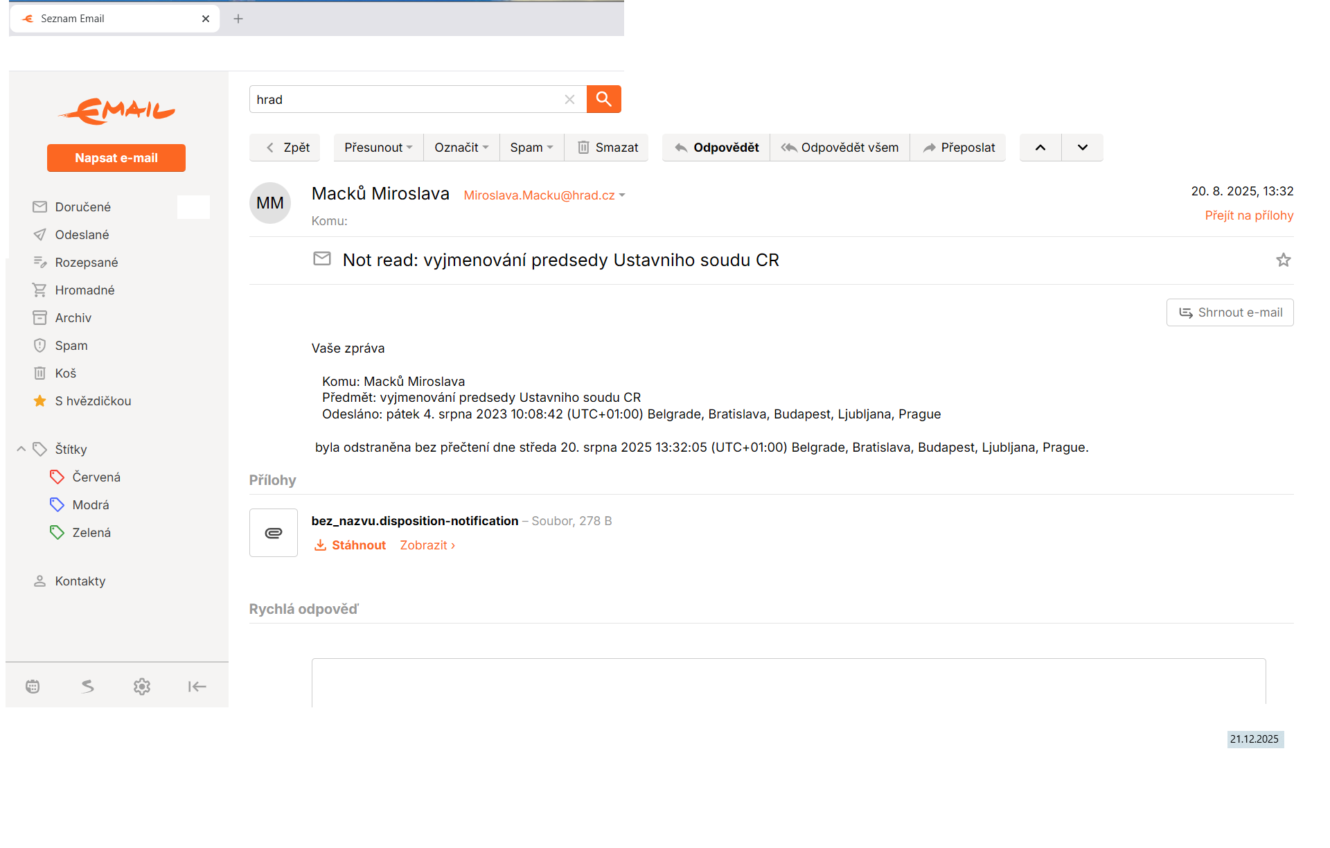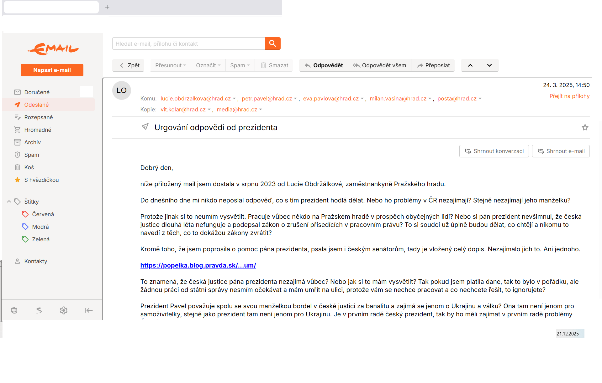 Můj mail Miroslava Macků (nejbližší spolupracovnice manželky prezidenta Evy Pavlové)vyhodila bez přečtení 2 roky po zaslání ode mně. Spolupracovnicí Evy Pavlové byla podle médií do 11.11.2025. Můj mail dostala 4.8.2023, vyhodila ho bez přečtení 20.8.2025.