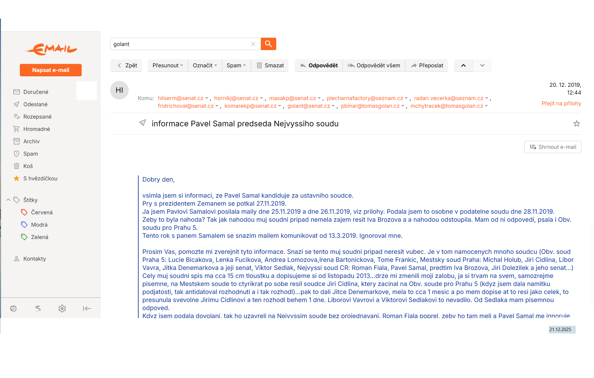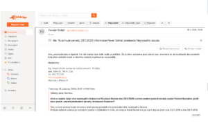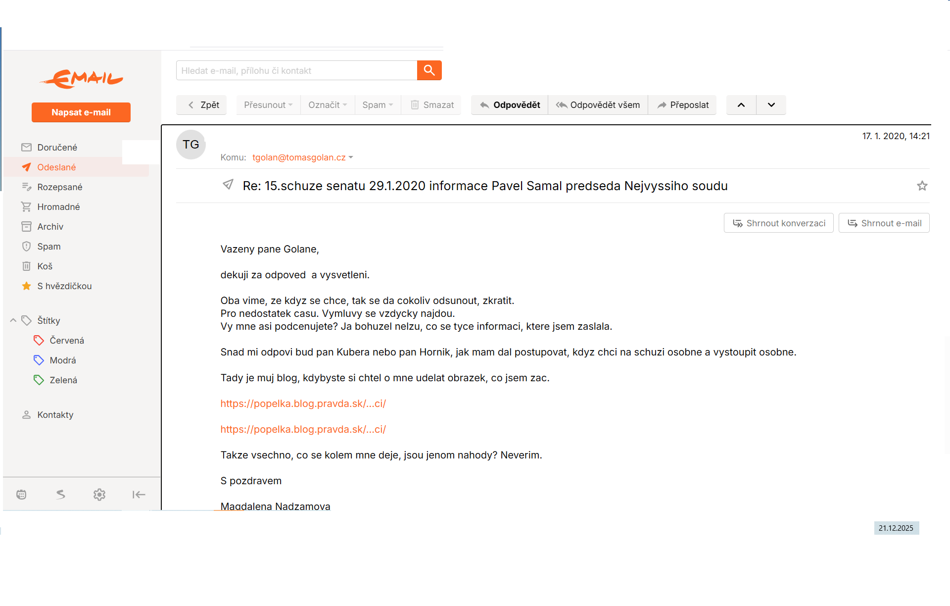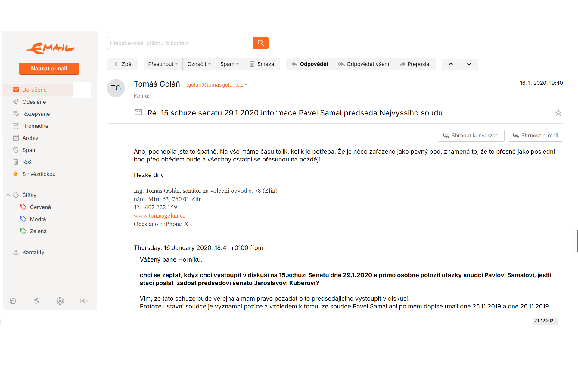 Odpověď senátora Tomáše Goláně z ledna 2020, kde mi napsal, že jsem to pochopila špatně a na vše bude dost času. Škoda, že se Pavla Šámala, který tehdy kandidoval za ústavního soudce nic nezeptal z toho, co jsem napsala v mailu. Je šéf výboru, který schvaloval ústavní soudce, tak měl na to příležitost se zeptat.