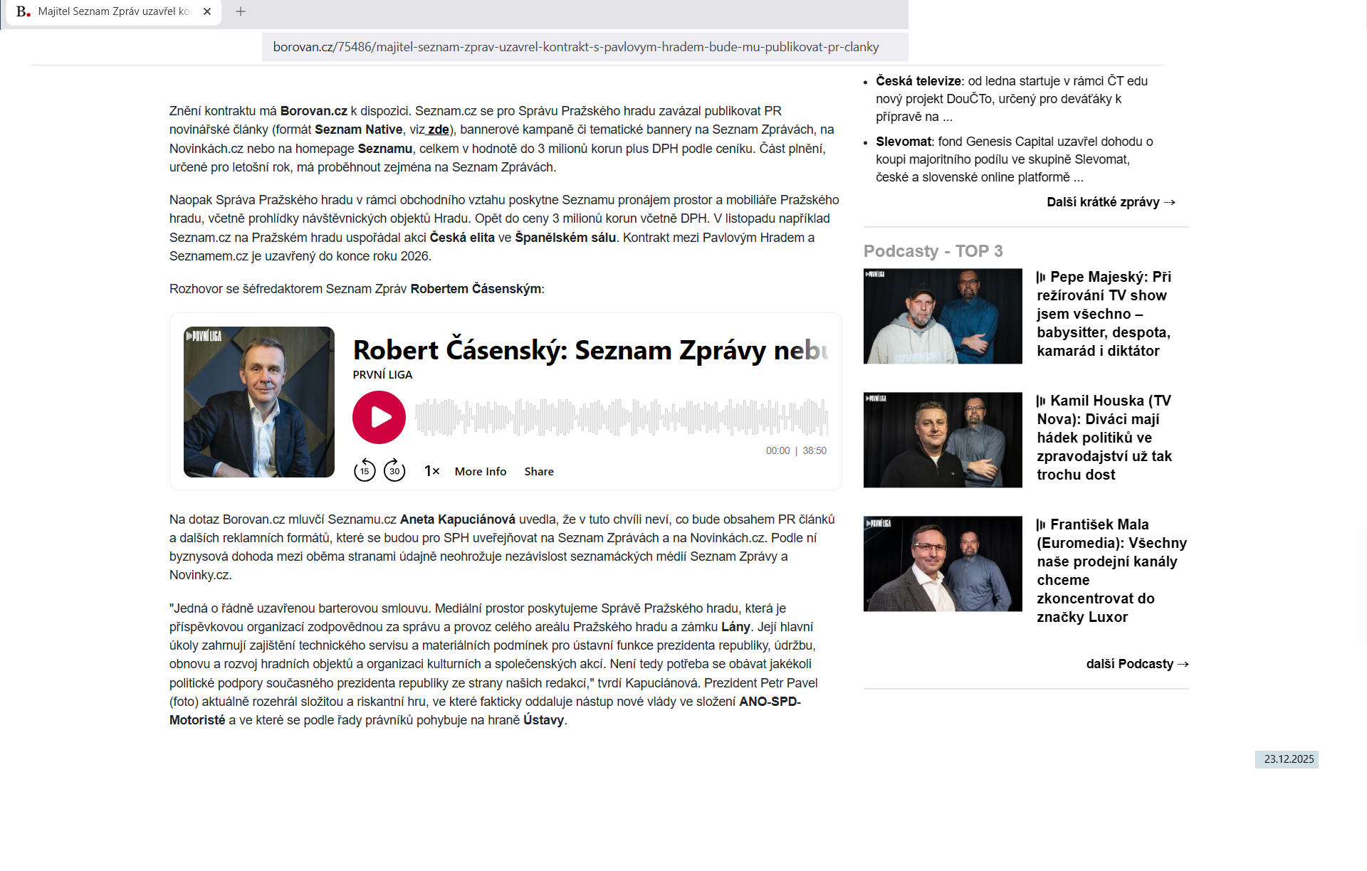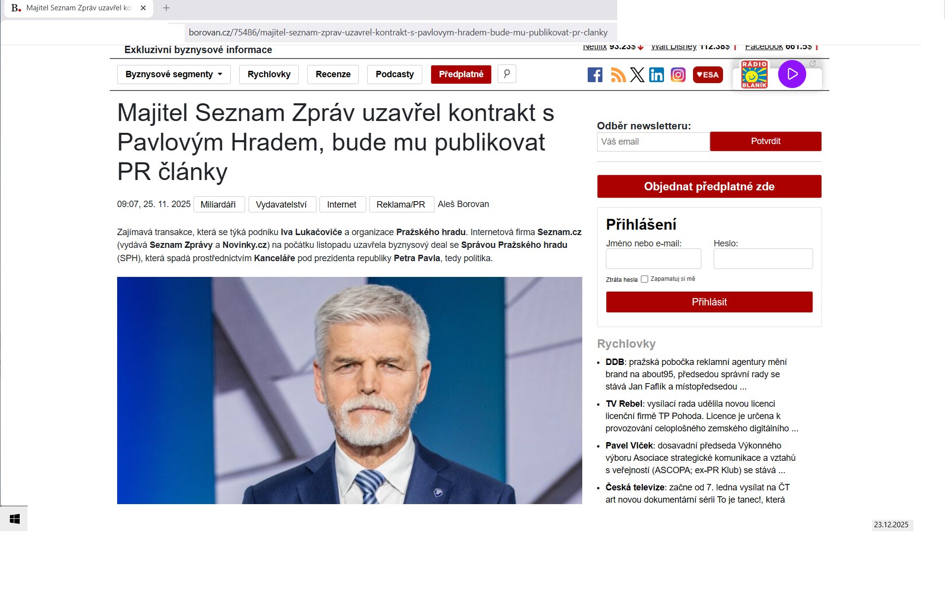 Zajímavá transakce, která se týká podniku Iva Lukačoviče a organizace Pražského hradu. Internetová firma Seznam.cz (vydává Seznam Zprávy a Novinky.cz) na počátku listopadu uzavřela byznysový deal se Správou Pražského hradu (SPH), která spadá prostřednictvím Kanceláře pod prezidenta republiky Petra Pavla, tedy politika.